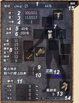 (1)、 角色等级与升级之EXP(2)、 角色现在HP/最大HP(3)、 角色现在MP/最大MP(4)、 角色现在的防御总值 (AC值)(5)、 角色身上所有物品负重量(6)、 角色 饿度(7)、 装备树状图,现在有使用的装备(8)、 角色现在能力值(9)、 现在可以使用的魔法等级(10)、角色每次MP回复的量(11)、角色对元素攻击的防御力(12)、角色属性(13)、角色回避率 (ER值)(14)、天堂时间表,日、夜各为现实世界2小时